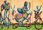 2010spelende dieren zoals een olifant op step giraf op rolschaatsen en een olifant op één wieler