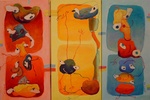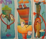 2007drieluik met drie verschillende bij elkaar passende voorstellingen boven op elkaar gestaapelde fantasie figuren